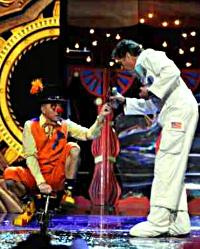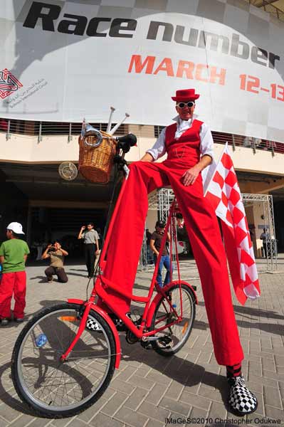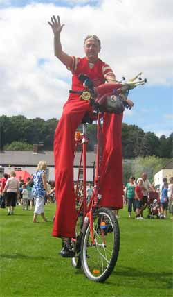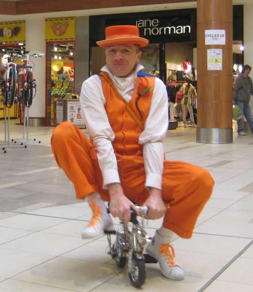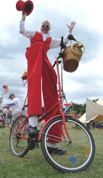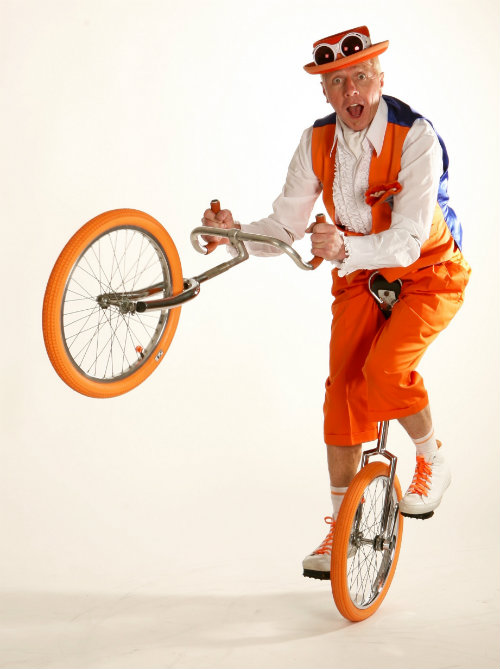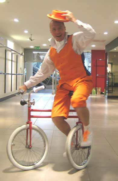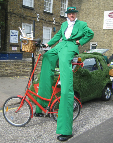 I can at any time dismount to perform as a stilt walker and to juggle and clown about; a basket can be fitted to the front or a case to the back to carry props, giveaways and information. New for 2017 is a splendid rear mounted powerful bubble machine!