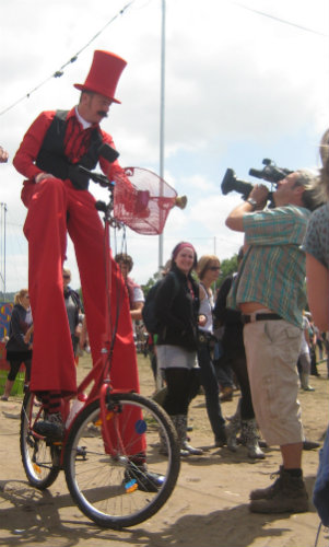 Stilt Bicycle. A specially (ridiculously) adapted bicycle ( it was a tall order...), standing over 6 feet high and currently bright red. The effect is absolutely stunning and perfect for parades, cycle/green events and large sites, I have also used it to great effect in several shows for the circus of light where I rode it around a Dickensian theatre! It also enables me to cover a huge area in an extremely groovy and visually superb way if required! For night time, ‘light up’ and festive events, the bike can be covered in super bright LED lighting this makes for a truly spectacular sight. Flags can also be fitted which look amazing as I ride by.