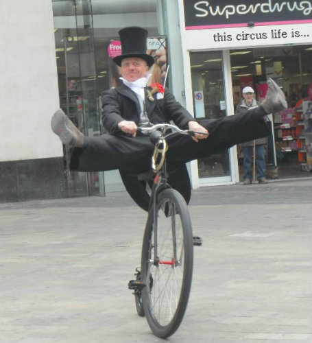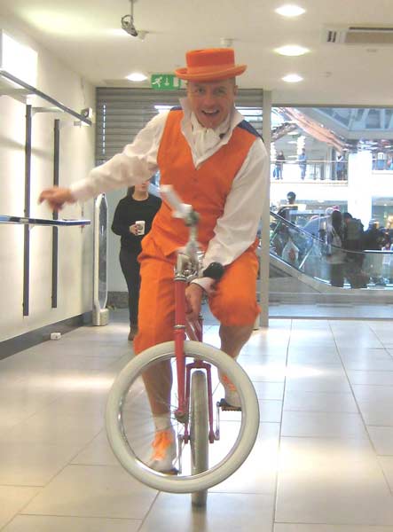 The Luni Bike - (L(a) Uni Bike) A curious machine designed by those crazy French folks, the handlebars spin and so does the seat and the wheels are very close together making some rather interesting tricks and riding positions possible, can be ridden very slowly, forwards, backwards and turned on the spot so is fine and safe even in a crowded area, great for clowning and bicycle events plus a real eye catcher for promotional applications, It is currently bright red with white tyres but can be painted any colour! I can also carry a tubular bag with juggling balls and a diabolo for impromptu shows.