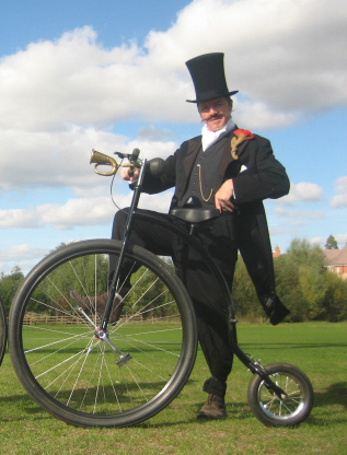 Penny Farthing. An authentic re production machine with a 36” front wheel, the size makes it safe to use in a crowded area whilst still creating great excitement. It can be used for all kinds of characters but is especially good with a Victorian gentlemen, Victorian policeman or Dapper chap. The Penny Farthing can also be festooned with LED lights for dark evening events and parades.