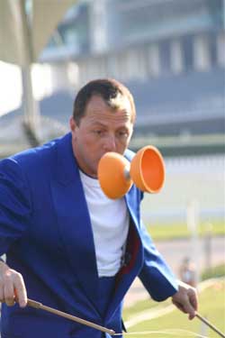 I juggle 1 to 5 balls, globalls, 3 clubs, 3 gloclubs, 3 knives, 3 Machetes, 3 rubber chickens, rubber eggs and 3 fire torches (although not all at the same time…) I carry these props in a smart suitcase when around and about in a walkabout style. The fire props have their own metallic case and fuel is carried in a compact steel flask plus a shiny red steel can for the rest!