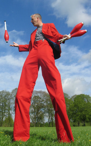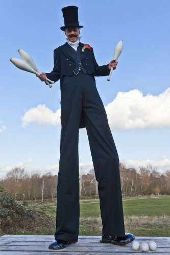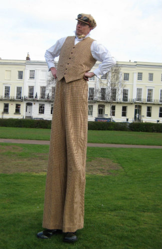 I take great pride in my appearance as an entertainer and stilt walk in many different tailored costumes such as red, orange, blue, green, black or white tuxedo, English tweed, USA, red/white stripes, complete dress tailcoat and stovepipe hat in red or black, clown, jester, sailor, pirate, racing driver and for Victorian, historical and festive events, a Dapper Victorian juggling gentleman, chirpy chimney sweep, Aristocratic dandy gentleman and a comedy Victorian/Old English policeman.